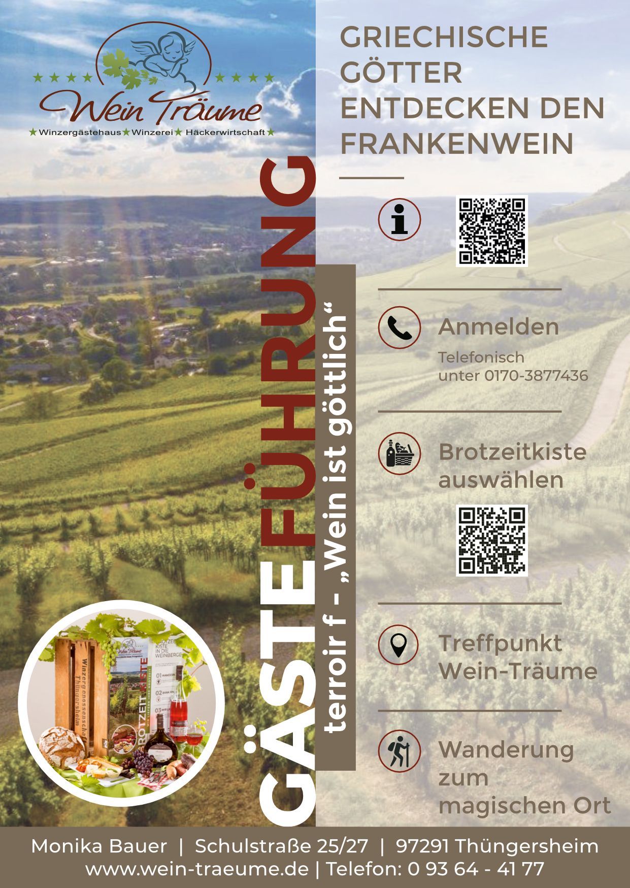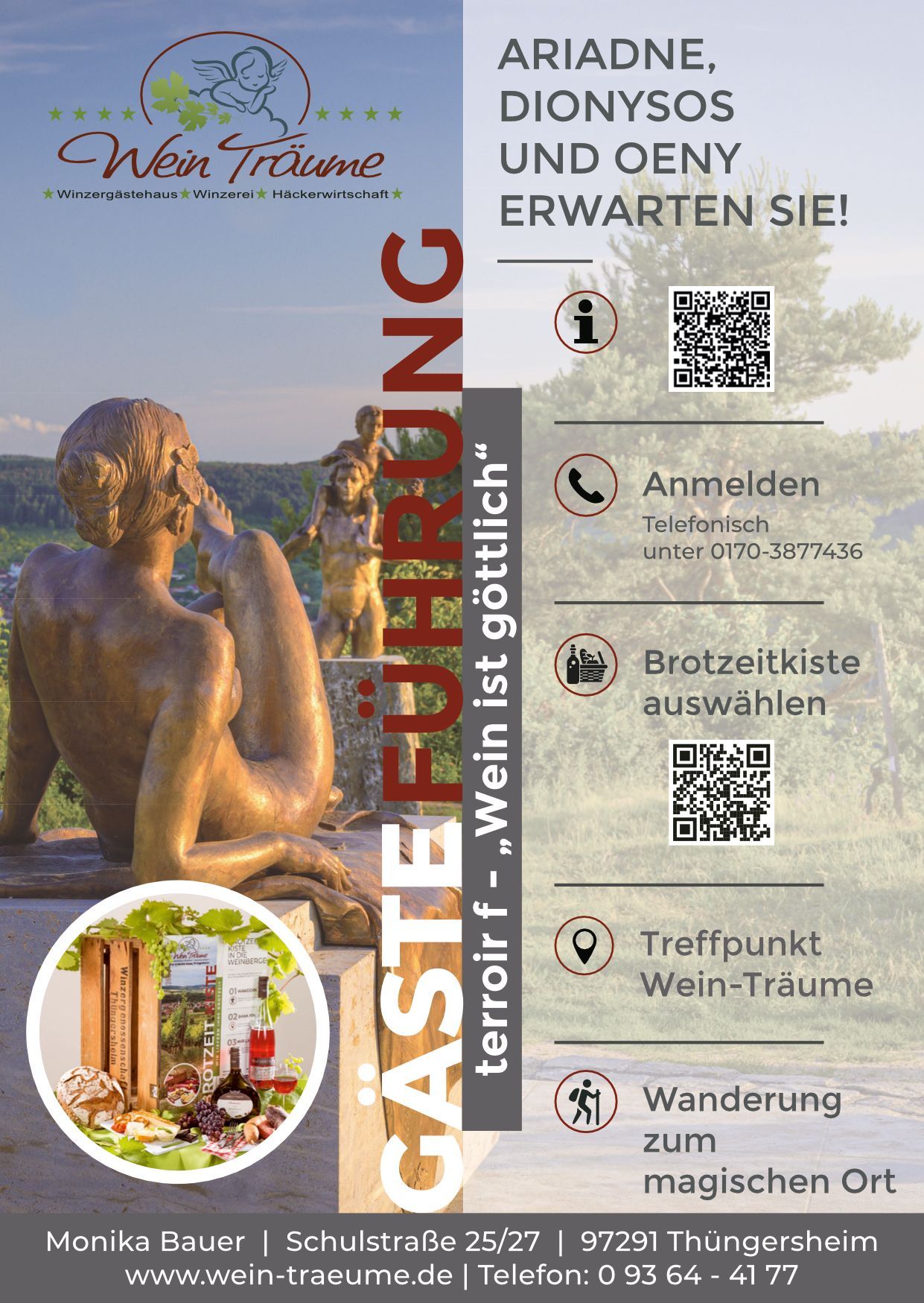 Gästeführung in den Weinbergen zur Götterfamilie am Magischem Ort. Auf den Weg dorthin erhalten Sie Informationen rund um den Weinbau, den Silvaner sowie die dramatische Geschichte von Ariadne, der ersten Weinkönigin. Am Ziel freuen Sie sich über ihre individuell gefüllte Brotzeitkiste.